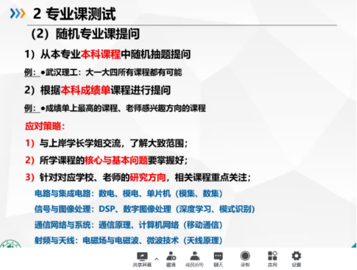吴其强学长围绕英语自我介绍、专业课测试、综合面试及注意事项四个方面分享,建议将复习重点放在专业课测试部分,多与成功上岸的学长学姐交流,了解重点范围,及时获取有效信息。此外吴其强还表示,大部分专业具有学科交叉性,建议选择调剂专业时可以多考虑科研院所。