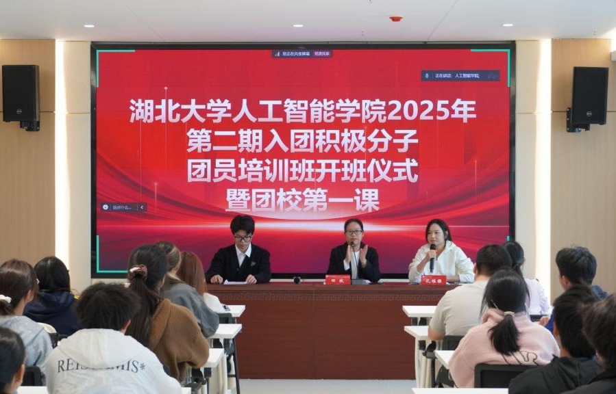 2025年10月31日中午12时,湖北大学人工智能学院2025年第二期入团积极分子、团员培训班开班仪式暨团校第一课,在产教大楼A710会议室举行,活动由学院团委书记孔维雅主持,学院党委副书记田牧,团校全体参训学员出席此次活动。